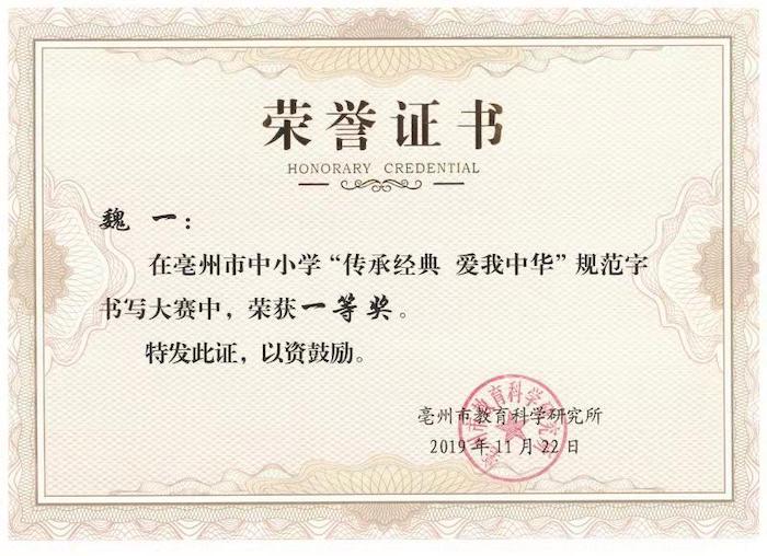 近日,亳州市教育局举办了亳州市中小学生“传承经典 爱我中华”规范字书写大赛。比赛结果揭晓新万博 共派出三名学生代表参加市级现场大赛全部获奖。其中颜世钰、魏一同学荣获亳州市中小学生规范字书写大赛一等奖。