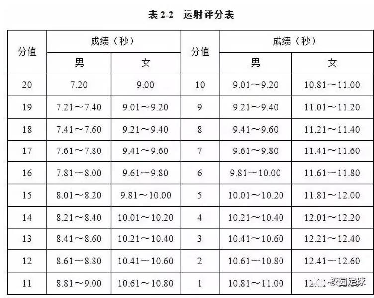 距离起点线(男)23米(女)18米,分别设置直径为3米、6米、9米的三个同心圆区域,测试学生将球传进相应的区域,以球的第一落点为准,三个区域的分值分别为4、3、2,每个考生传五球,分数相加。
