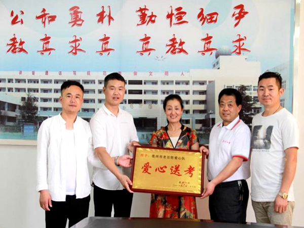最后,佟广付将写有“爱心送考”的牌匾送到亳州市老百姓爱心队会长王涛手中,并与他们合影留念。